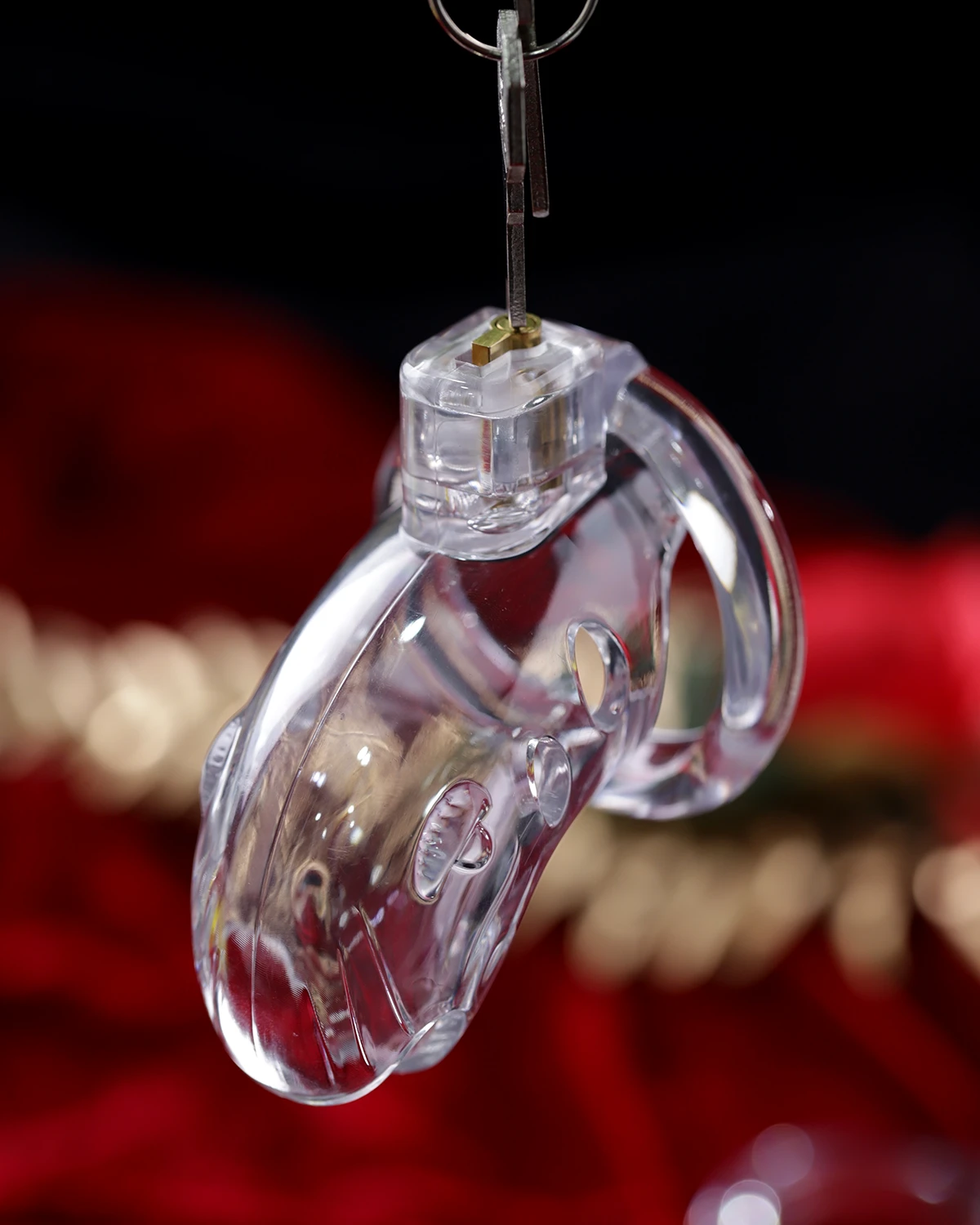Constructed from strong, transparent hard plastic, this BDSM cock cage is built to last through countless sessions. The see-through material is not only visually appealing but also safe and hygienic, avoiding any discomfort or irritation during use. Small perforations add an extra touch of elegance while allowing breathability and hygiene. The sturdy lock mechanism provides reliable security, and the key is designed for easy control by the dominant partner, increasing excitement and suspense.
