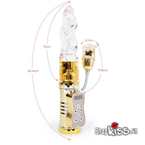 With a total length of 25 cm and a diameter of 3 cm, this vibrator offers a perfect balance between comfortable insertion and satisfying fullness. Weighing only 305 grams, it is portable yet substantial enough to provide a fulfilling experience. The handle is extravagantly finished with a shimmering golden metallic coating, blending luxury with functionality for an elegant, modern aesthetic. The sleek design of the silicone parts complements the golden handle, making this toy a visual delight as well as a pleasure device.
